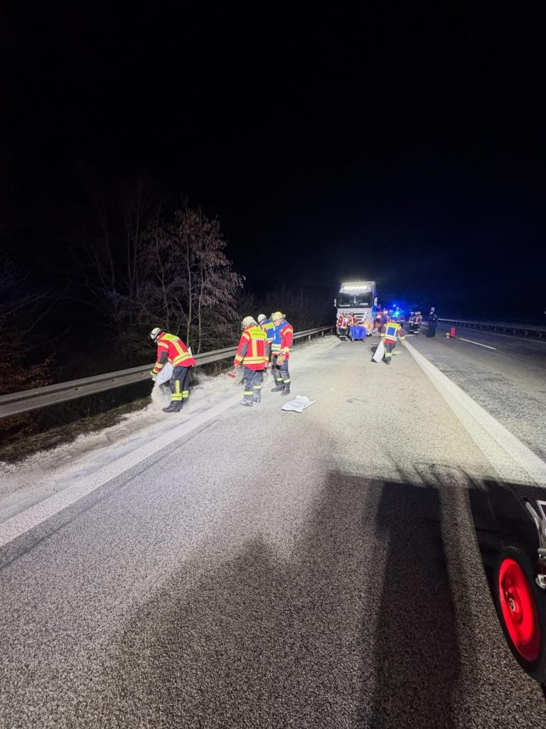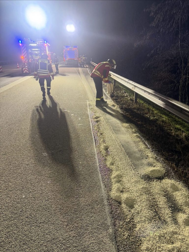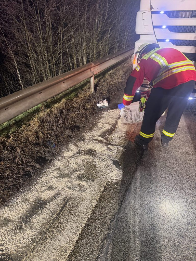 Am späten Abend eine weitere Alarmierung. Wir wurden zu auslaufenden Betriebsstoffen aus einem LKW auf die A 48 gerufen. Im Bereich der Überleitung von A 48 auf A 3 in Fahrtrichtung Köln stand ein LKW, dessen Verbindungsschlauch zwischen den beiden Tanks in Folge eines technischen Defekts abgerissen war. Somit trat Diesel aus, der durch unsere Einsatzkräfte großflächig abgestreut und somit gebunden wurde.