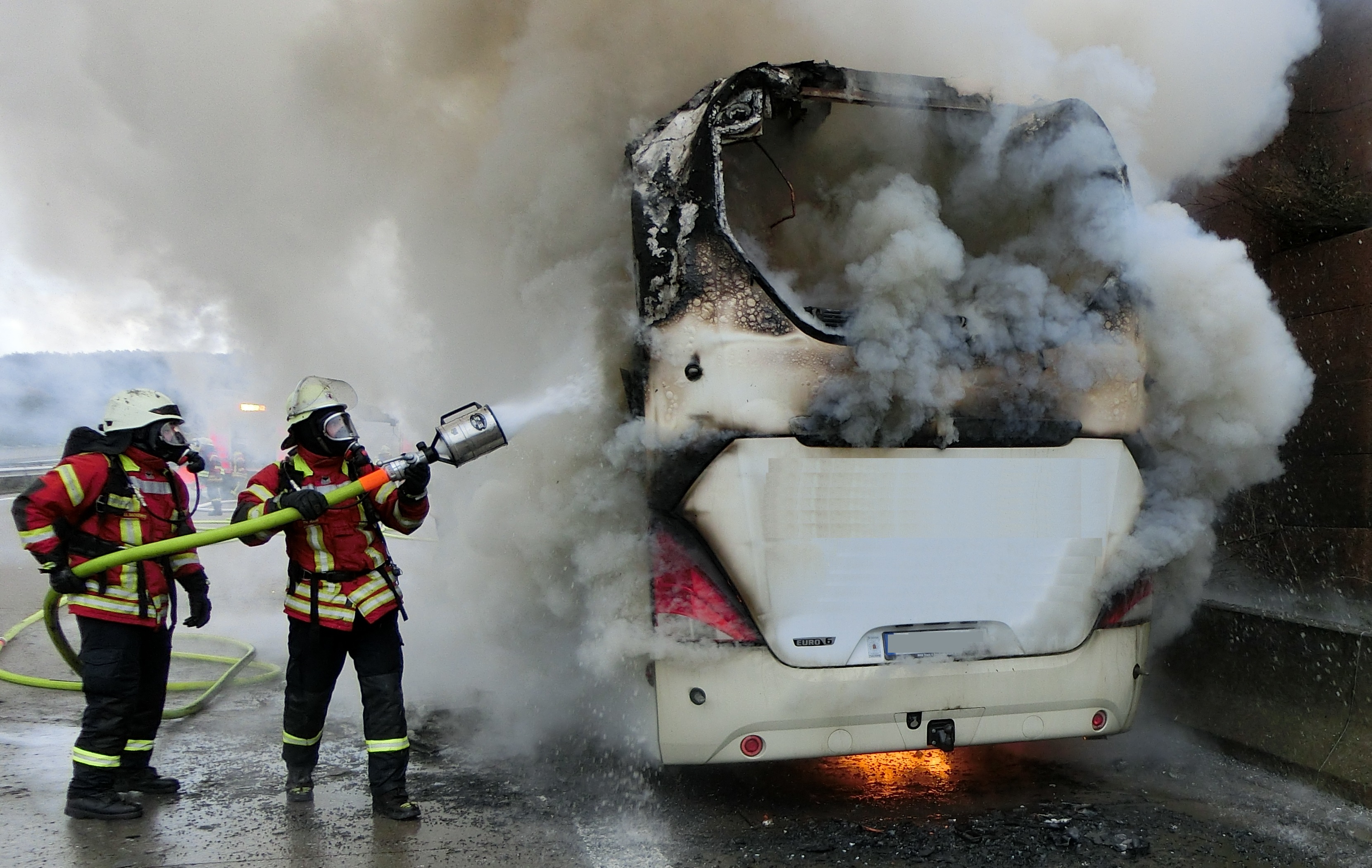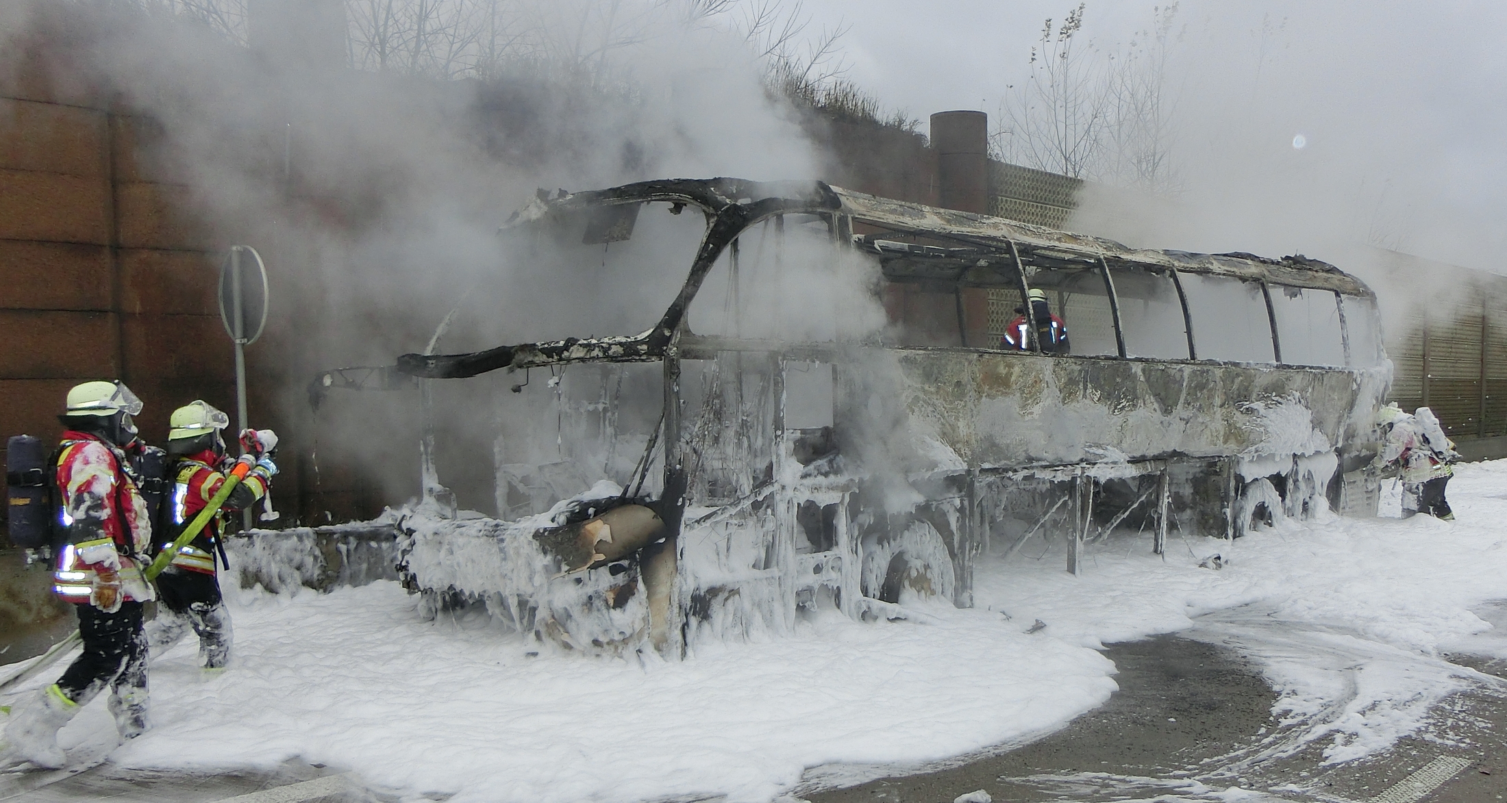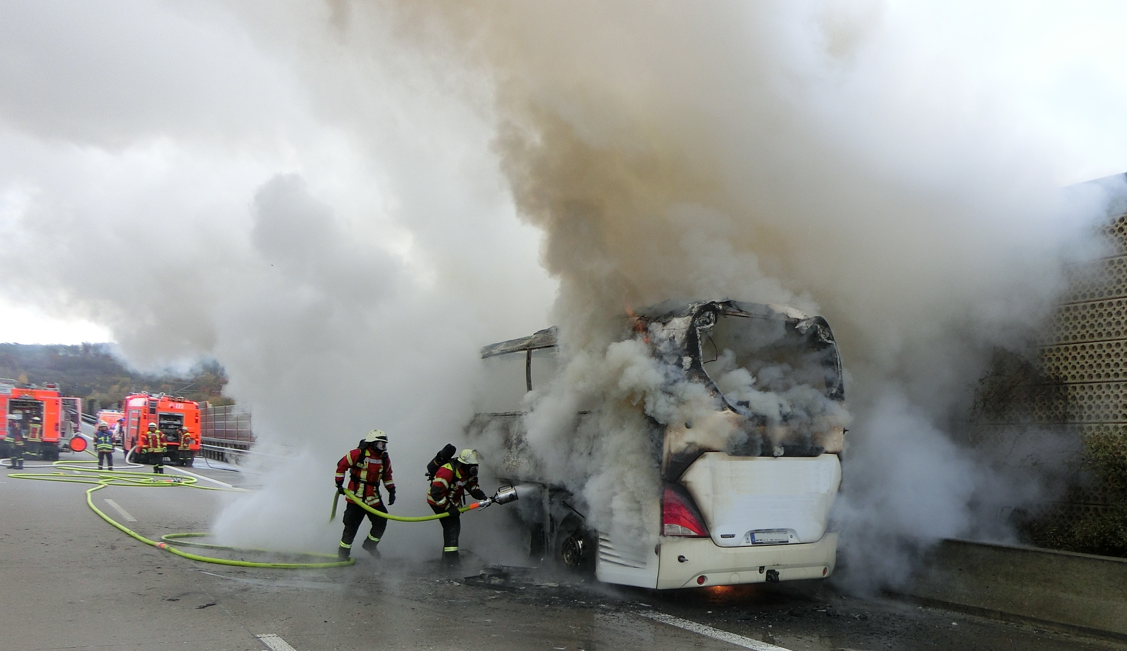 Am 19.11.2019 um 12:30 Uhr befand sich eine Streife der Polizeiautobahnstation Montabaur auf der Bundesautobahn 3 in Fahrtrichtung Frankfurt. Einige hundert Meter vor dem Streifenwagen, bei Kilometer 74, Gemeinde Oberhaid, wurde eine Rauchentwicklung aus einem Reisebus, welcher sich bereits auf dem Standstreifen befand, festgestellt. Kurze Zeit später geriet das Heck des Fahrzeuges in Brand, wobei das Feuer in der Folge auf den gesamten Reisbus übergriff. Durch den nun entstandenen Vollbrand wurde auch die unmittelbar angrenzende Lärmschutzwand der ICE-Strecke in Mitleidenschaft gezogen, wodurch es zu erheblichen Einschränkungen im Bahnverkehr kam. Der Fahrzeugführer des Reisebusses konnte sich unverletzt aus dem Bus retten. Dieser befand sich auf einer Leerfahrt. Schätzungsweise dürfte ein Schaden von umgerechnet ca.500000 Euro entstanden sein. Aufgrund der Lösch- und Bergungsarbeiten musste die BAB 3 in Rtg. Frankfurt/Main für ca. 2 Stunden voll gesperrt werden. Es entstand zeitweise ein Rückstau von ca. 20 KM. Eine örtliche Umleitung wurde eingerichtet. In Fahrtrichtung Köln musste die Fahrbahn aufgrund der Löscharbeiten und der starken Rauchentwicklung für ca. 45 Minuten voll gesperrt werden. Im Einsatz befand sich die Feuerwehren Ransbach-Baumbach, Deesen und Selters mit 70 ehrenamtlichen Kräften. Die Autobahnmeisterei Ammerich mit 5 Mitarbeitern, das DRK mit RTW sowie die hiesige Dienststelle mit insgesamt 8 Beamten.