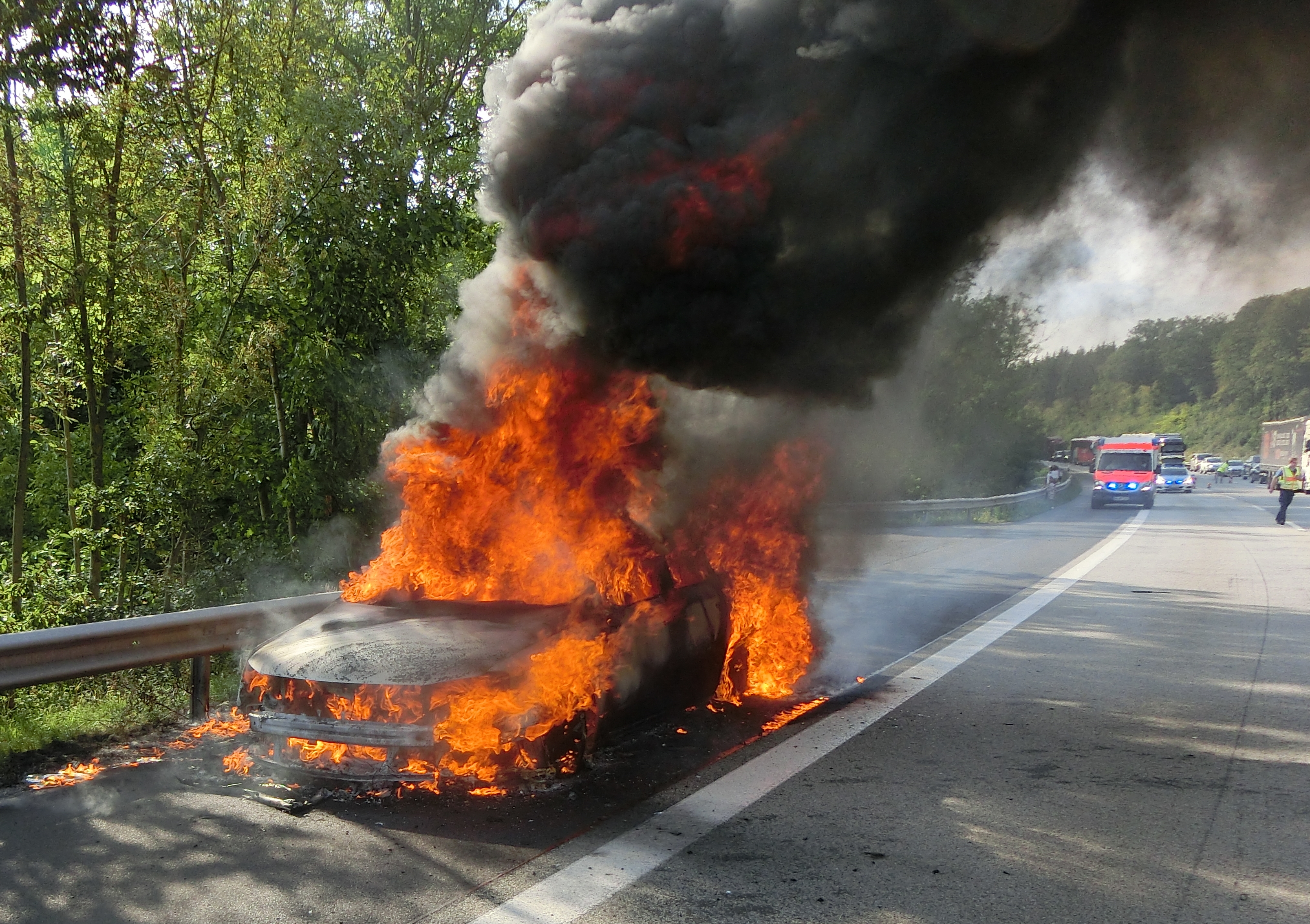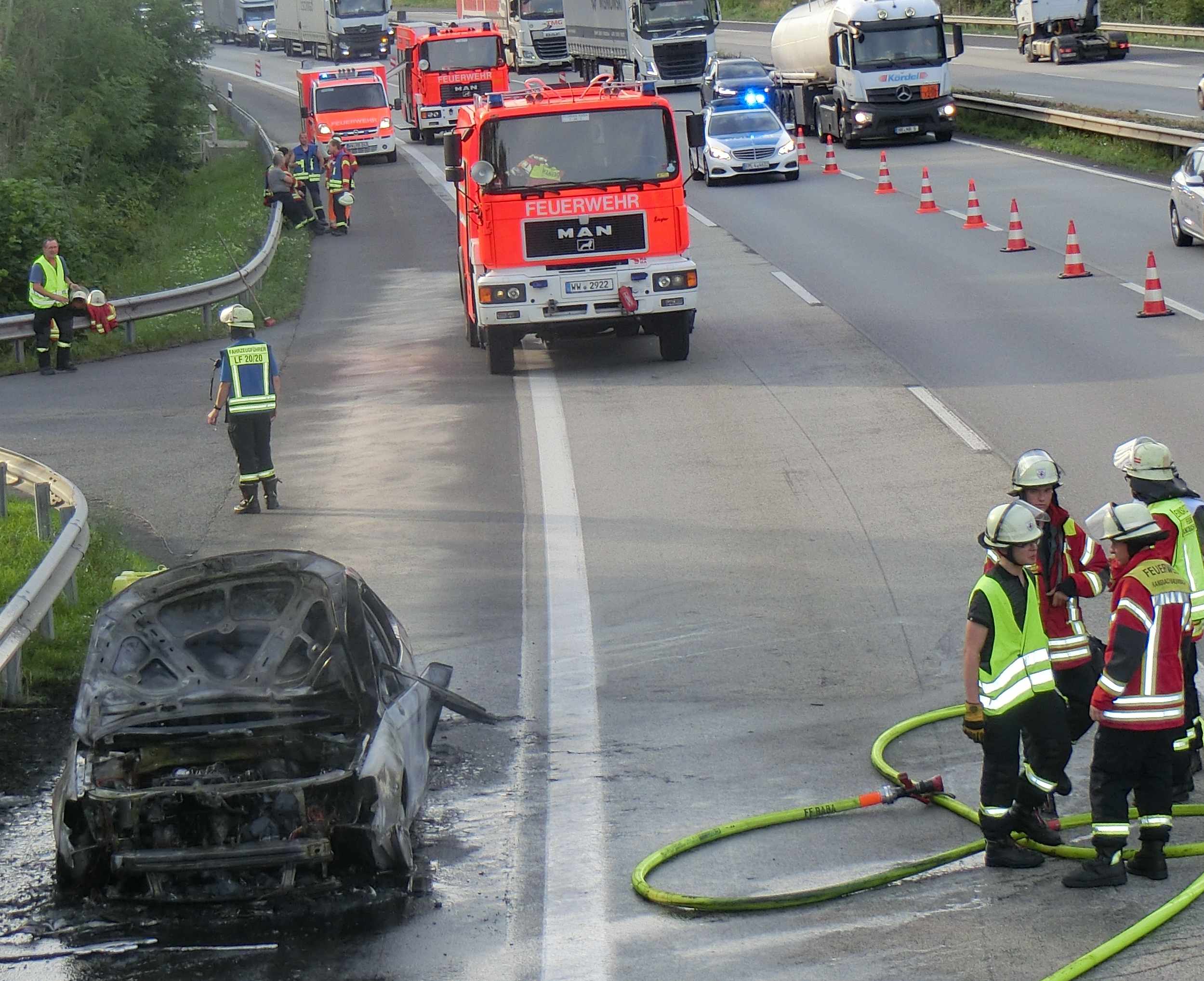 Am heutigen Nachmittag um 17:14 Uhr wurde der Polizeiautobahnstation Montabaur, durch mehrere Verkehrsteilnehmer, ein Fahrzeugbrand auf der BAB 3 in FR Frankfurt am Main gemeldet. Bei Kilometer 72,000 konnte auf dem Seitenstreifen ein in Vollbrand stehender Pkw der Marke VW erkannt werden. Die insgesamt fünf Fahrzeuginsassen konnten sich rechtzeitig aus dem Fahrzeug begeben, sodass niemand verletzt wurde. Durch Kräfte der FFW Ransbach-Baumbach konnte der Brand gelöscht werden. Der Pkw brannte komplett aus, sodass Totalschaden entstand. Darüber hinaus wurde die Fahrbahn am Brandort beschädigt. Während der Löscharbeiten und darüber hinaus mussten der rechte und mittlere Fahrstreifen gesperrt werden. Hierdurch bildete sich Rückstau von bis zu vier Kilometern. Die Verkehrsbeeinträchtigung wird voraussichtlich noch bis ca. 19 Uhr andauern.
