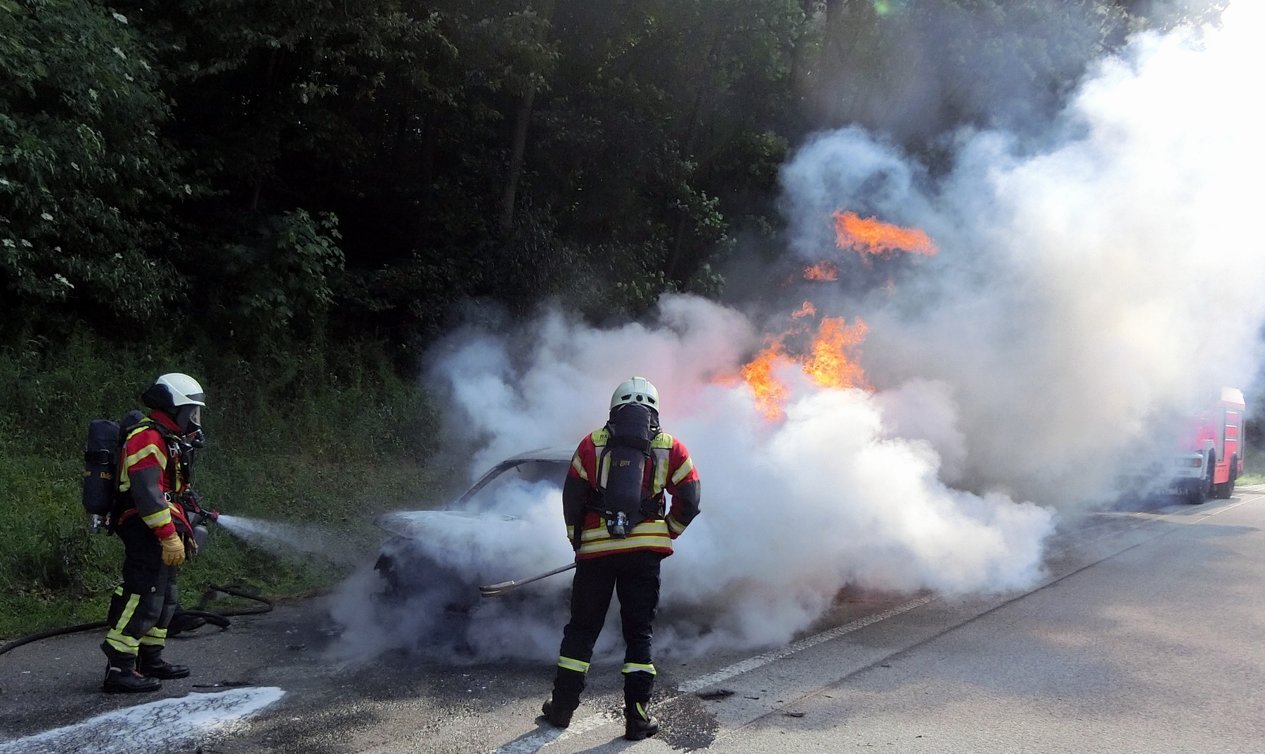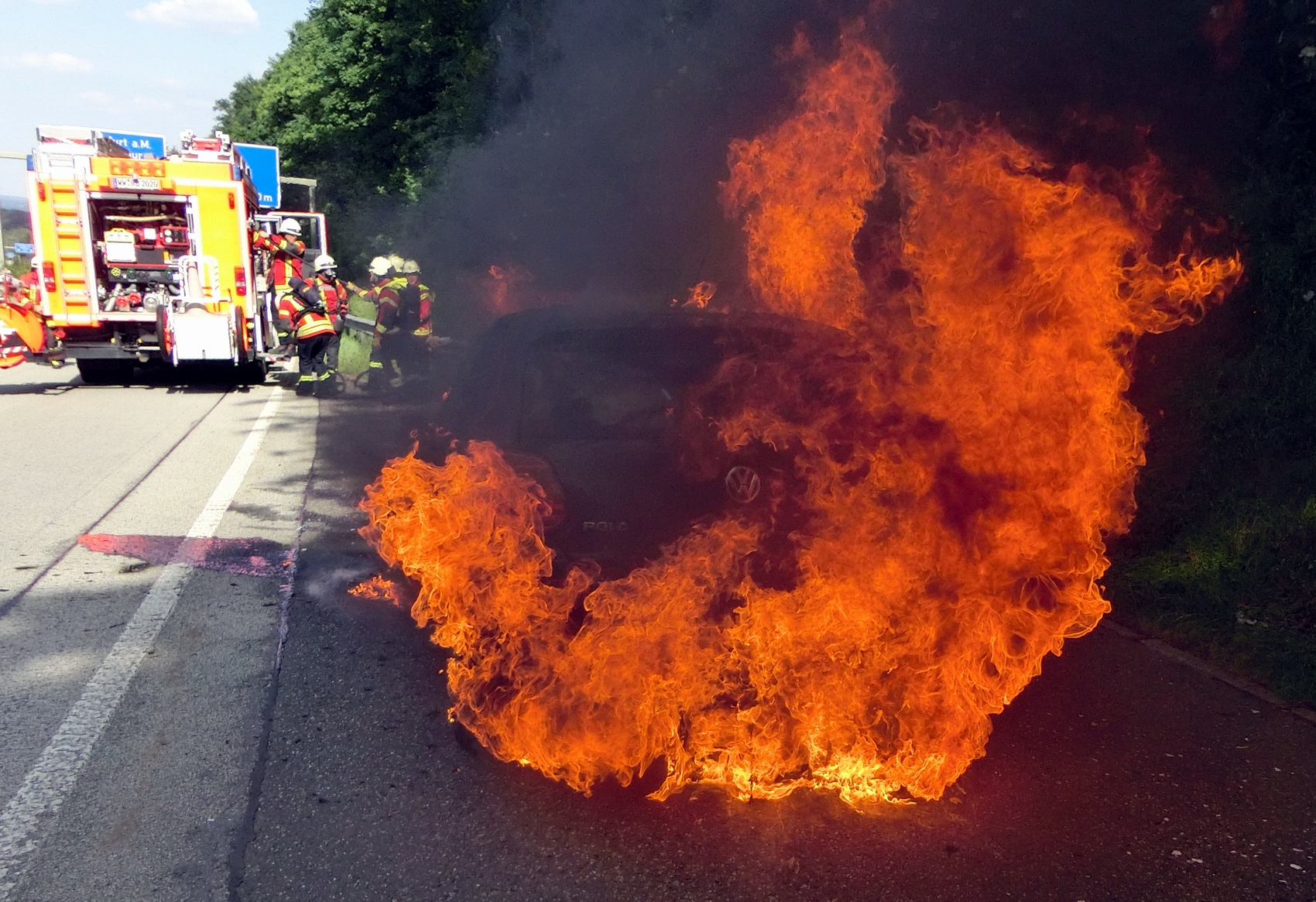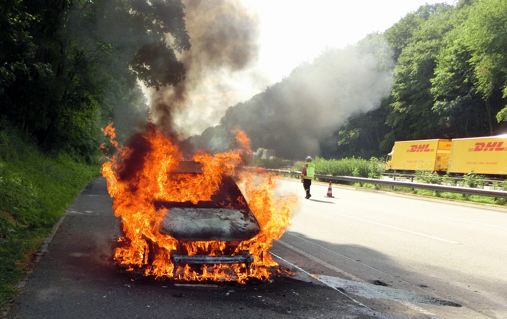 Am 24.06.19 gegen 17:00 Uhr wurde der Polizeiautobahnstation Montabaur ein brennender PKW auf der Bundesautobahn 48, vier Kilometer vor dem Dernbacher Dreieck in selbiger Fahrtrichtung gemeldet. Beim Eintreffen der ersten Einsatzkräfte stand der PKW bereits in Vollbrand. Zuvor befuhren die beiden Fahrzeuginsassen den rechten Fahrstreifen und bemerkten einen plötzlichen Leistungsverlust des PKW sowie leichte Rauchbildung aus dem Motorraum. Der PKW wurde daraufhin in einer Nothaltebucht abgestellt. Zu diesem Zeitpunkt drangen bereits die ersten Flammen aus der Motorhaube, welche kurze Zeit später in den Innenraum übergriffen. Die beiden Fahrzeuginsassen konnten sich unverletzt, jedoch deutlich unter Schock stehend, aus dem Fahrzeug retten. Nach dem jetzigen Ermittlungstand entstand der Brand durch einen technischen Defekt. Ungefähr 30 Minuten später fuhr auf der Bundesautobahn 48 in Fahrtrichtung Koblenz, in unmittelbarer Nähe des brennenden PKW, ein Fahrzeugführer mit seinem PKW auf dem rechten Fahrstreifen auf ein ebenfalls auf dem rechten Fahrstreifen abgestelltes Pannenfahrzeug auf. Die beiden Fahrzeuginsassen haben das Pannenfahrzeug auf dem rechten Fahrstreifen lediglich mit angeschalteter Warnblinklichtanlage abgestellt, ohne weitere Sicherungsmaßnahmen zu treffen. Der auffahrende PKW-Führer nahm das Pannenfahrzeug aufgrund dessen sowie tiefstehender Sonne zu spät war, wodurch es zum Zusammenstoß beider Fahrzeuge kam. Verletzt wurde niemand. Aufgrund der beiden Ereignisse wurde die Bundesautobahn 48 in beide Fahrtrichtungen zwischenzeitlich gesperrt.