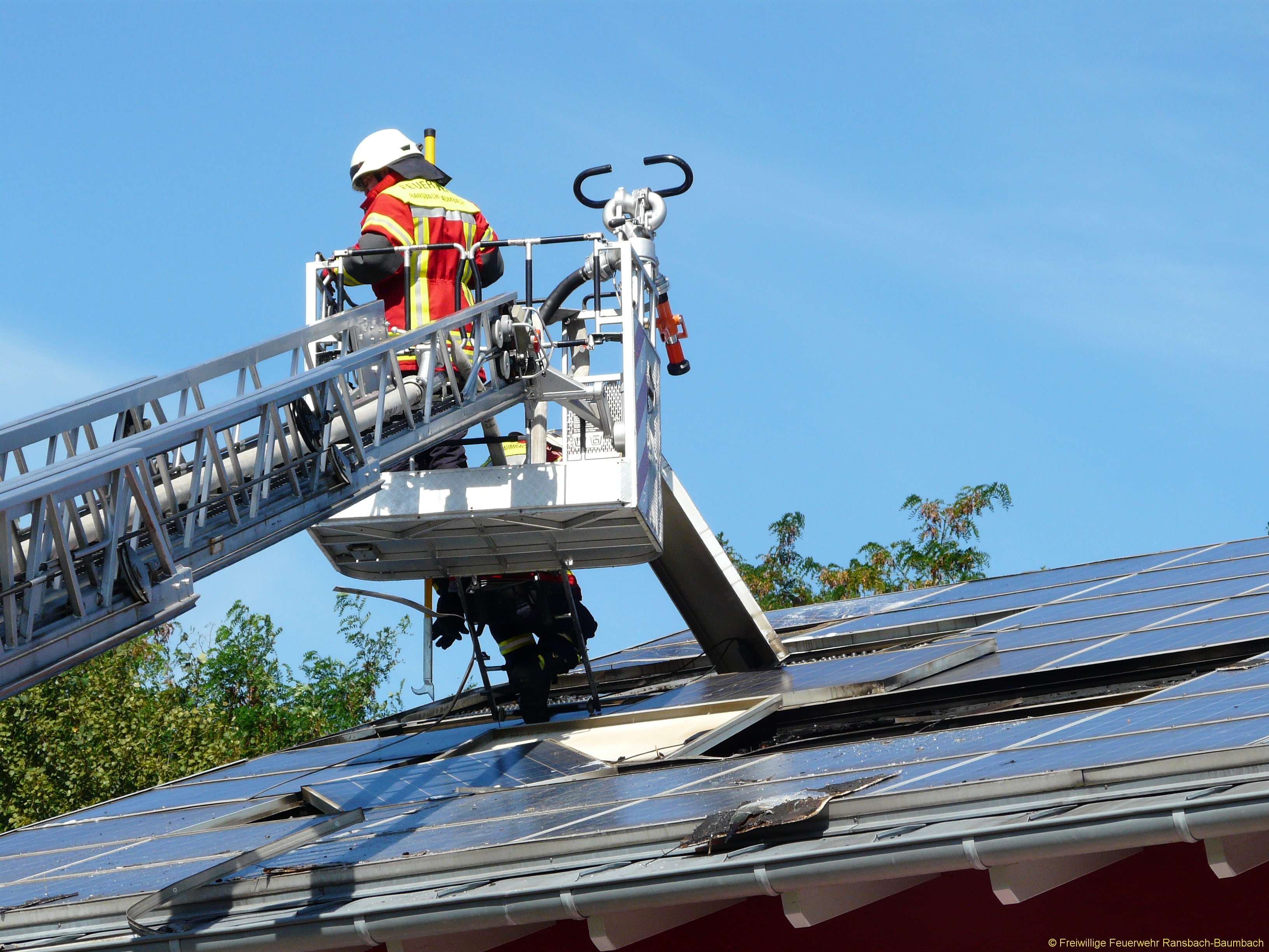 Ransbach-Baumbach. Als die ersten Einsatzkräfte an dem Wohnhaus eintrafen stand der Speicher in Flammen. Mit gezielten Innenangriffen konnte der Brand abgelöscht werden. Augenscheinlich ging der Brand nach noch nicht bestätigten Meldungen von der großflächig installierten Fotovoltaik Anlage aus. Er fraß sich durch die Dachdämmung in den Innenraum.