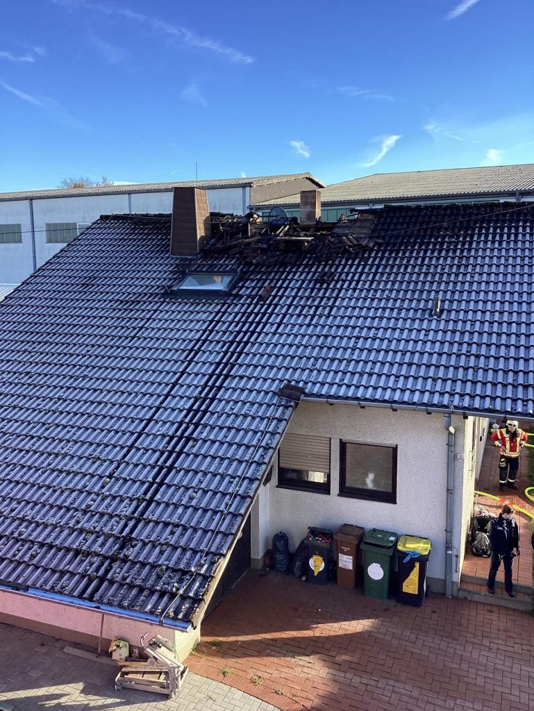 Nachdem der Schornsteinfeger den Kamin begutachtet hatte, wurde vom Trupp im Korb der Drehleiter das Dach um den Kamin geöffnet, um die in Brand geratenen Balken unter der Dacheindeckung freizulegen und abzulöschen.