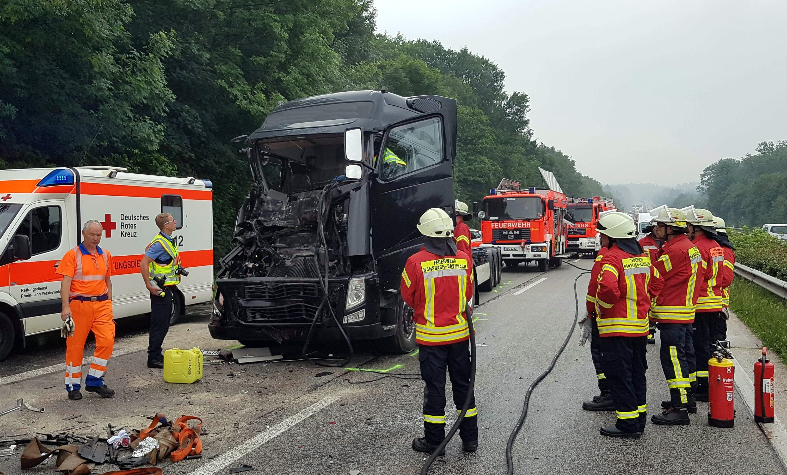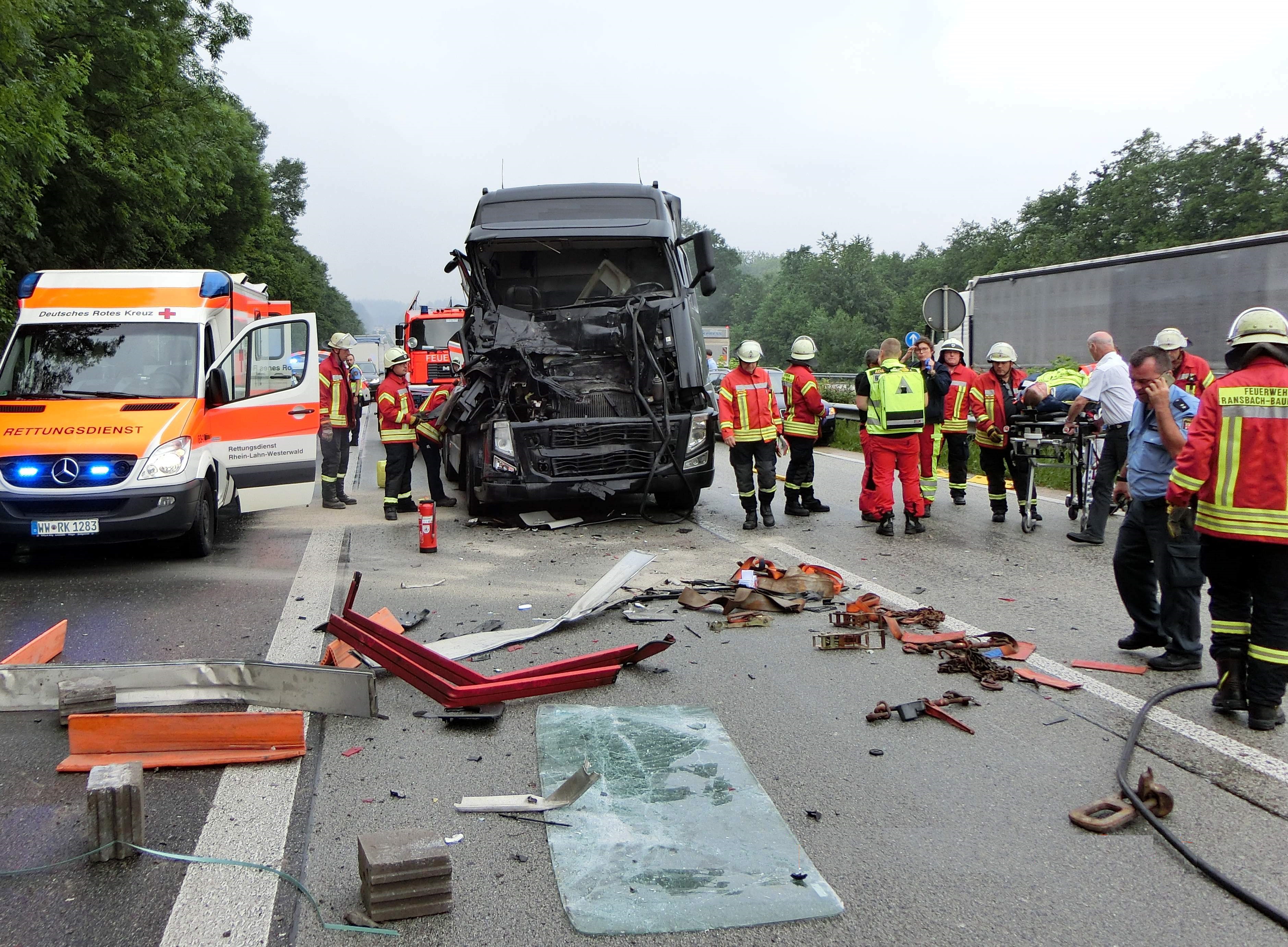 Der schwere Unfall hat sich nach Angaben der Autobahnpolizei gegen 8.30 Uhr ereignet. Zwei Sattelzüge waren von Höhr-Grenzhausen in Richtung Dernbacher Dreieck unterwegs. Dass der Verkehr plötzlich stockte, bemerkte der Fahrer des einen Lastwagens zu spät und fuhr auf den Vordermann auf. Der Zusammenprall war so heftig, dass der Lkw-Fahrer schwer verletzt ins Krankenhaus gebracht wurde.