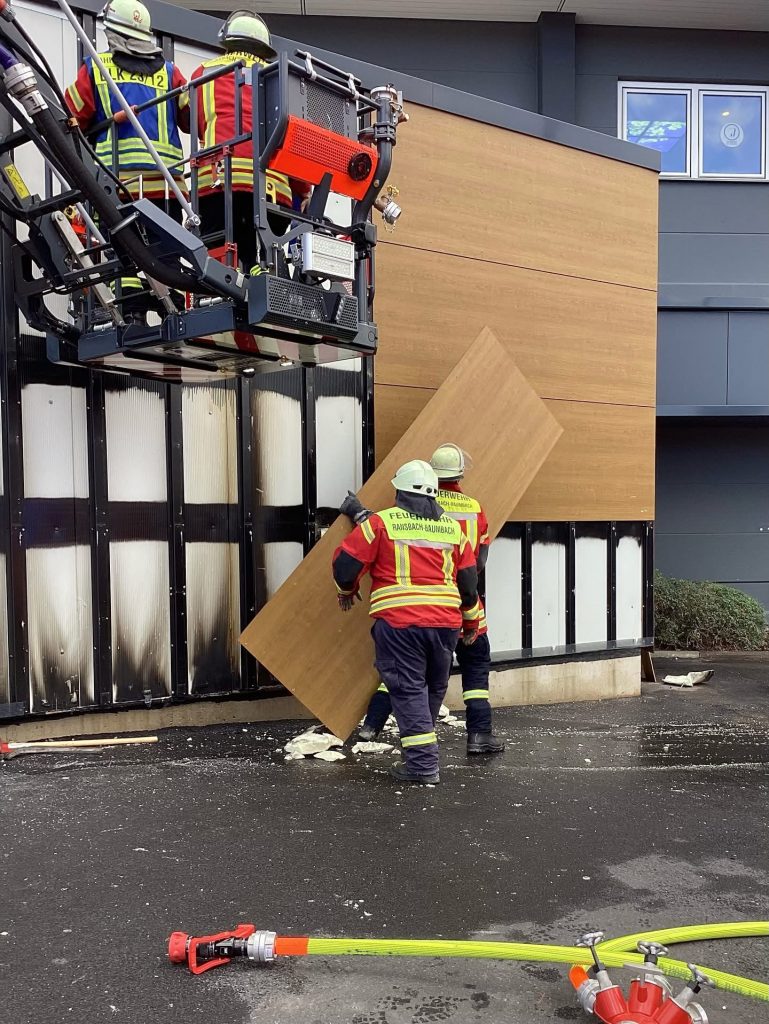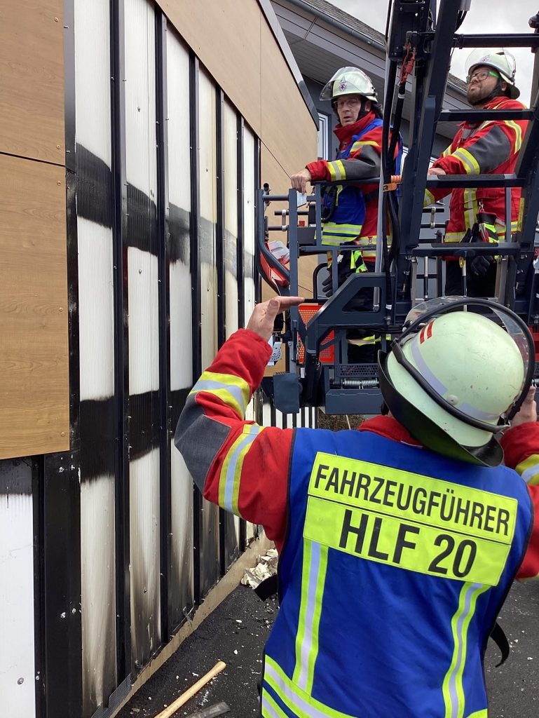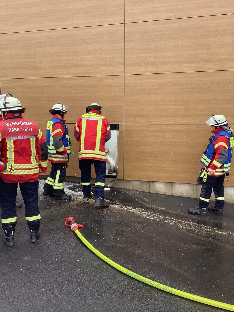 Bei Arbeiten vor dem Gebäude ist ein Teil der Außenfassade in Brand geraten. Der Brand wurde durch den Angrifstrupp abgelöscht. PArallel wurde der Supermarkt geräumt und auf weitere Personen kontrolliert.