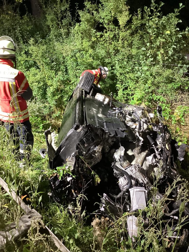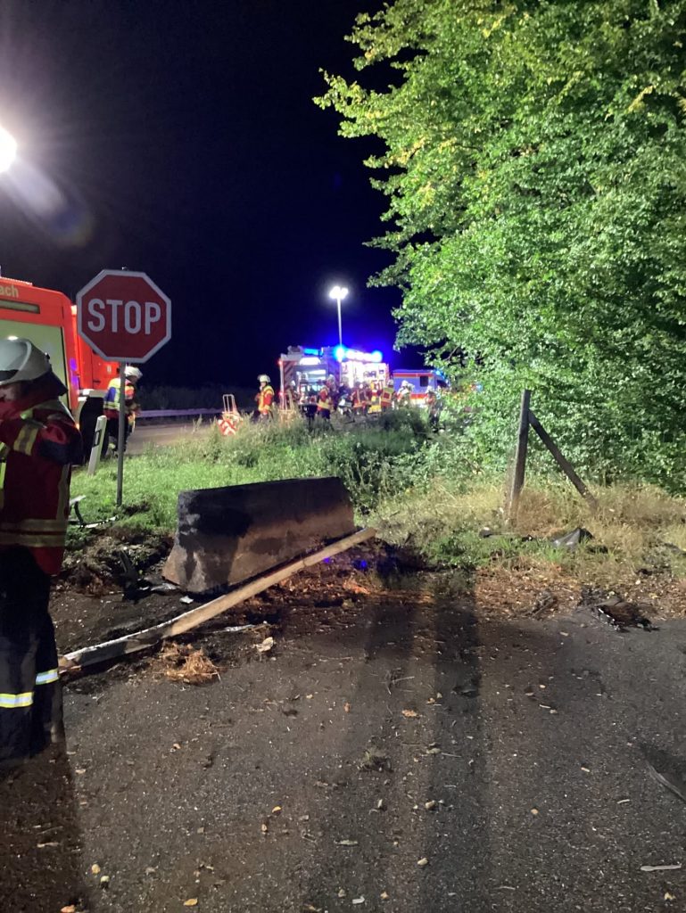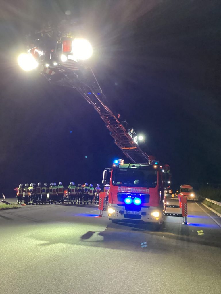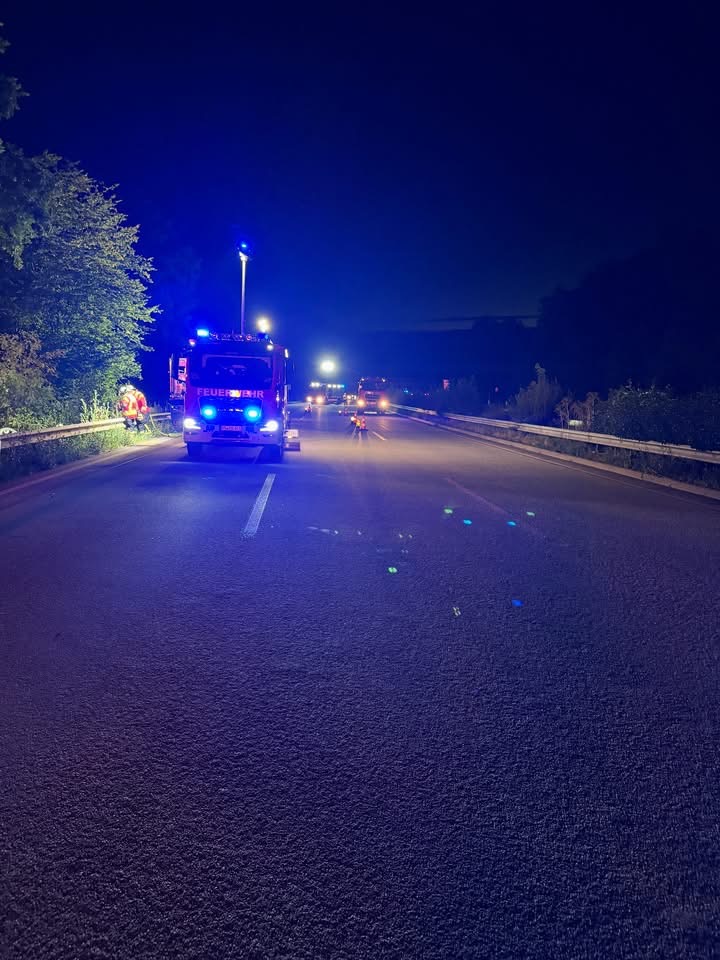 Um kurz nach 21 Uhr wurden wir zusammen mit der Feuerwehr Höhr-Grenzhausen zu einem schweren Verkehrsunfall auf die A48, Höhe Notabfahrt Baumbach, gerufen. Auf Anfahrt kam die Rückmeldung über die Leitstelle, dass auf Grund mehrerer, unterschiedlicher Notrufe unklar war, was genau und wo was passiert war. Unser KDOW war als ersteintreffendes Fahrzeug an der Unfallstelle und bestätigte die Meldung Verkehrsunfall. Ein Auto hat hier die Fahrbahn verlassen, mehrere Betonelemente sowie die Schranke der Notabfahrt getroffen und sich überschlagen, bis es kopfüber im Graben zum Stehen gekommen ist. Glücklicherweise befanden sich die beiden Insassen nicht mehr im Fahrzeug, denn mit unserem Eintreffen begann der PKW zu brennen. Der Angriffstrupp startete direkt einen Löschangriff und erstickte die Flammen im Keim. Die mitalarmierte Feuerwehr Höhr-Grenzhausen richtete gemeinsam mit der Polizei eine Vollsperrung der Richtungsfahrbahn ein, so dass wir gefahrlos arbeiten konnten.
