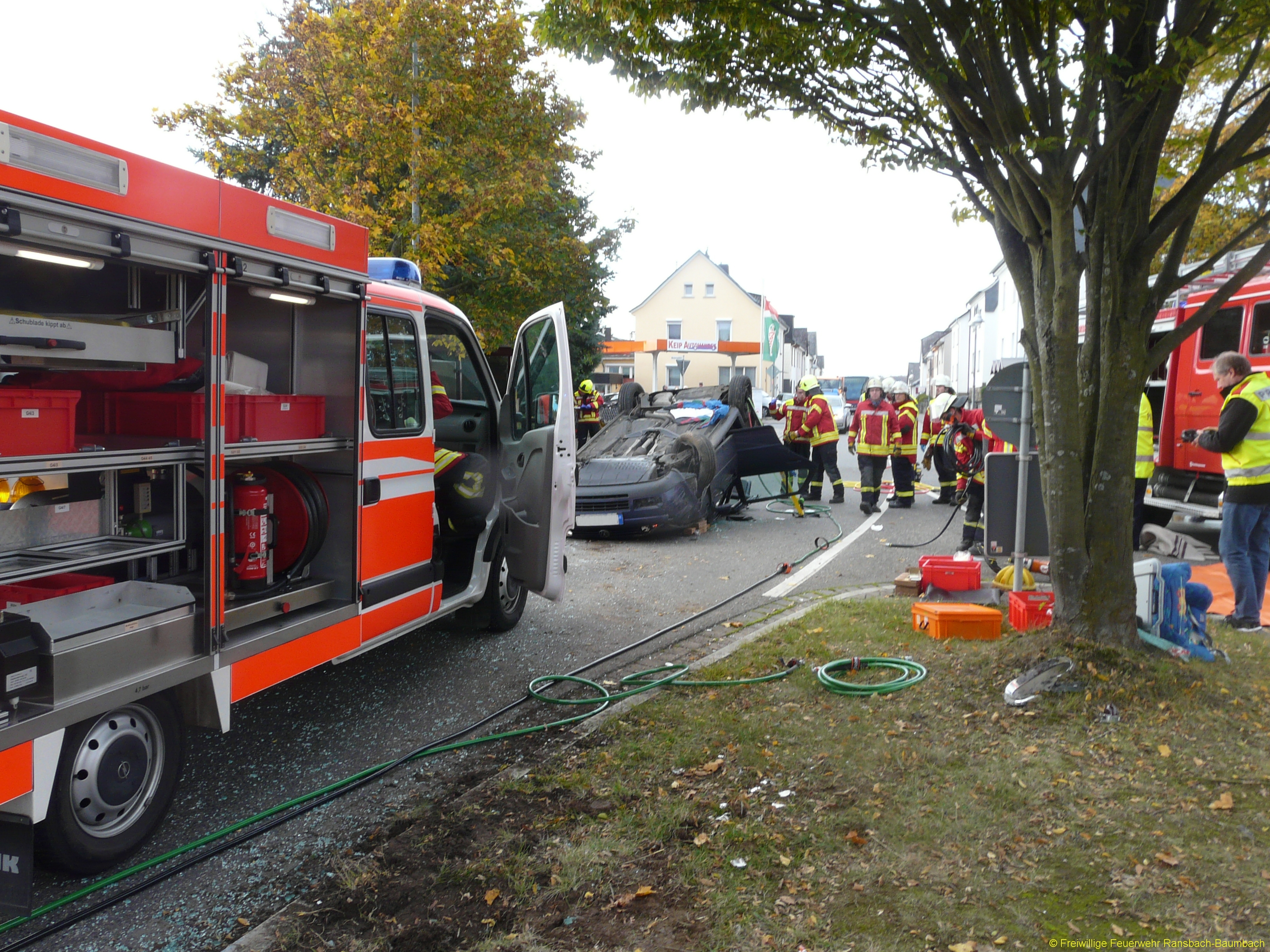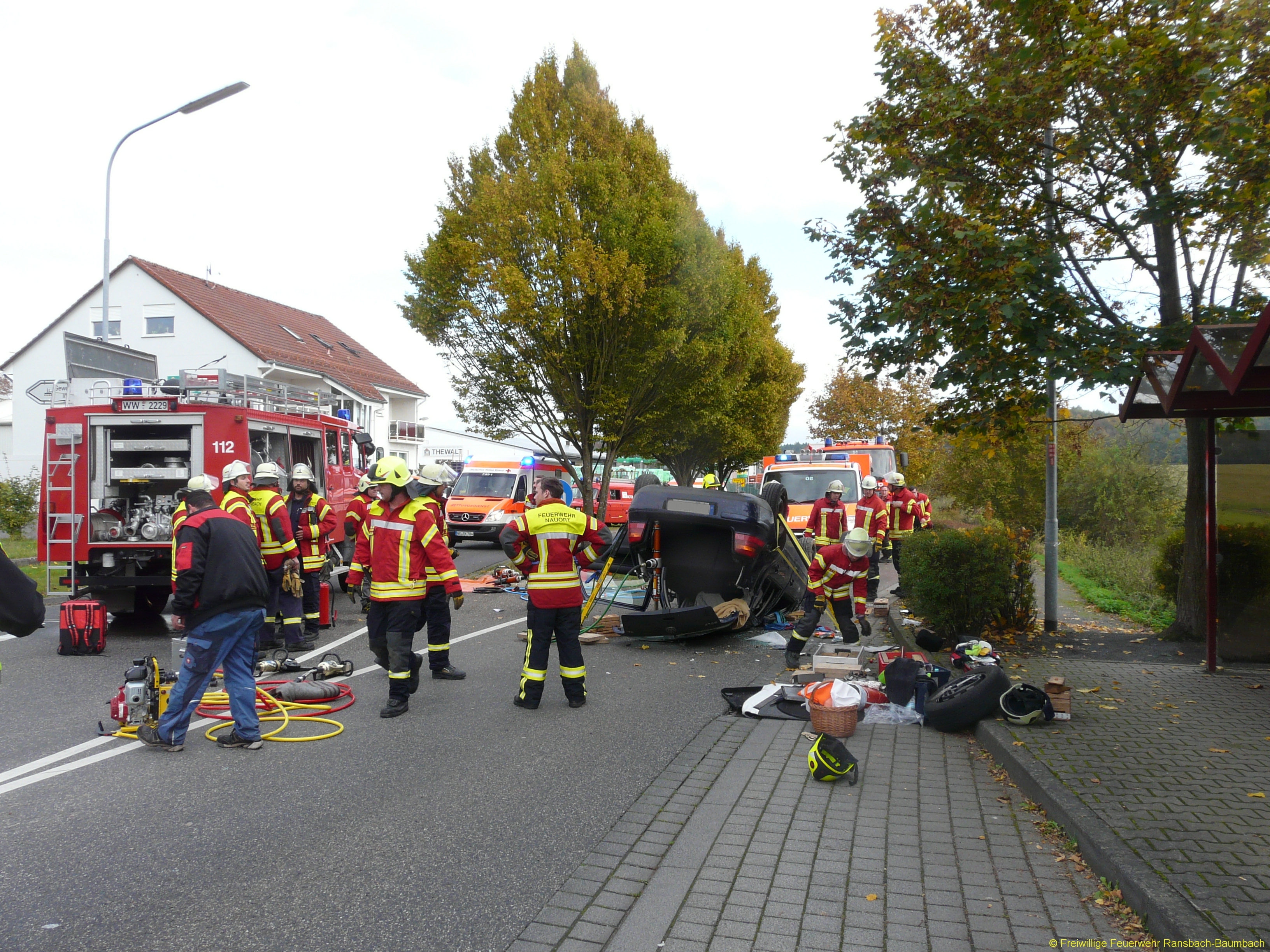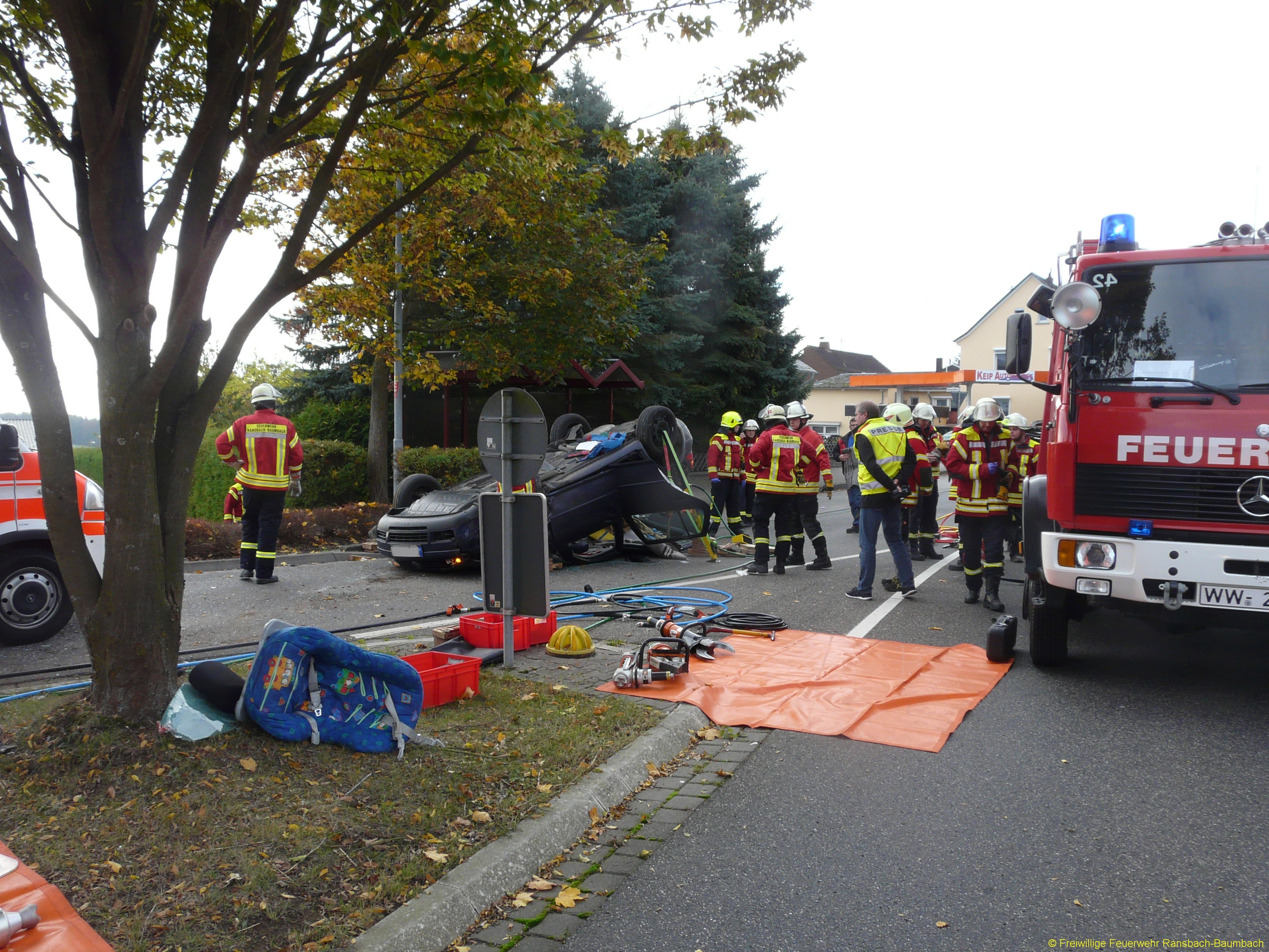Die Fahrerin wurde in ihrem auf dem Dach liegenden Fahrzeug eingeklemmt und schwer verletzt. Verschiedene Feuerwehren aus der Verbandsgemeinde Ransbach-Baumbach waren vor Ort. Nach Stabilisierung des PKW wurde das Fahrzeug im hinteren Bereich aufgeschnitten und die Fahrerin aus ihrem Fahrzeug gerettet. Ein Notarzt war vor Ort und übernahm die Erstversorgung. Auf Grund der Schwere der Verletzungen musste die Frau mit einem Rettungshubschrauber in ein Krankenhaus geflogen werden.