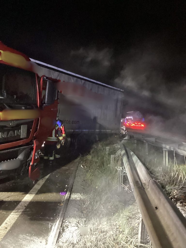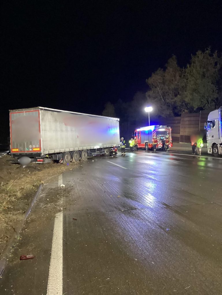 Ein LKW war aus bislang ungeklärter Ursache in die Mittelleitplanke geraten. Der Fahrer konnte sein Fahrzeug selbstständig verlassen und wurde bereits vom Rettungsdienst betreut. Eine eingeklemmte Person lag somit nicht vor.