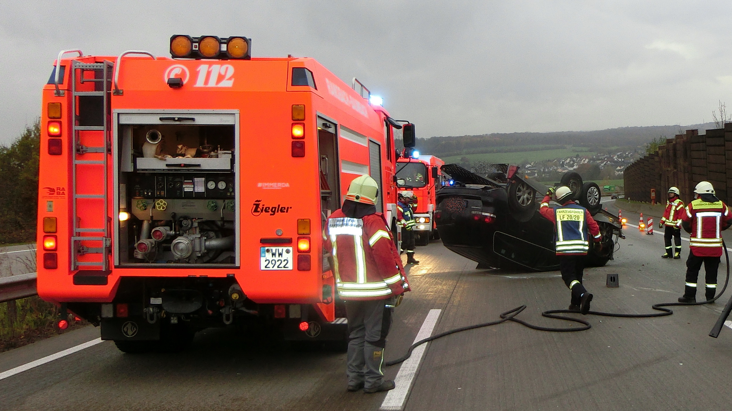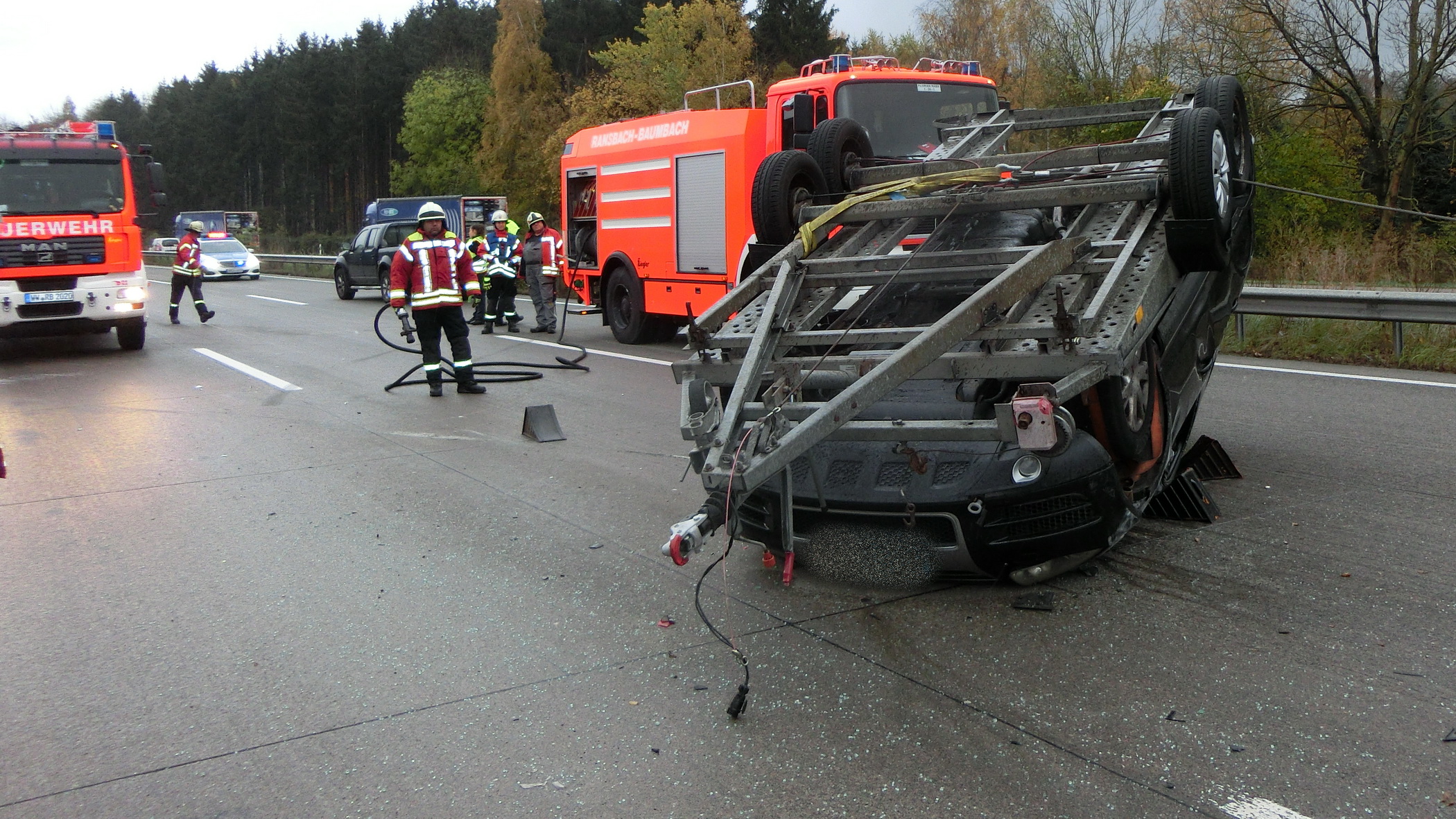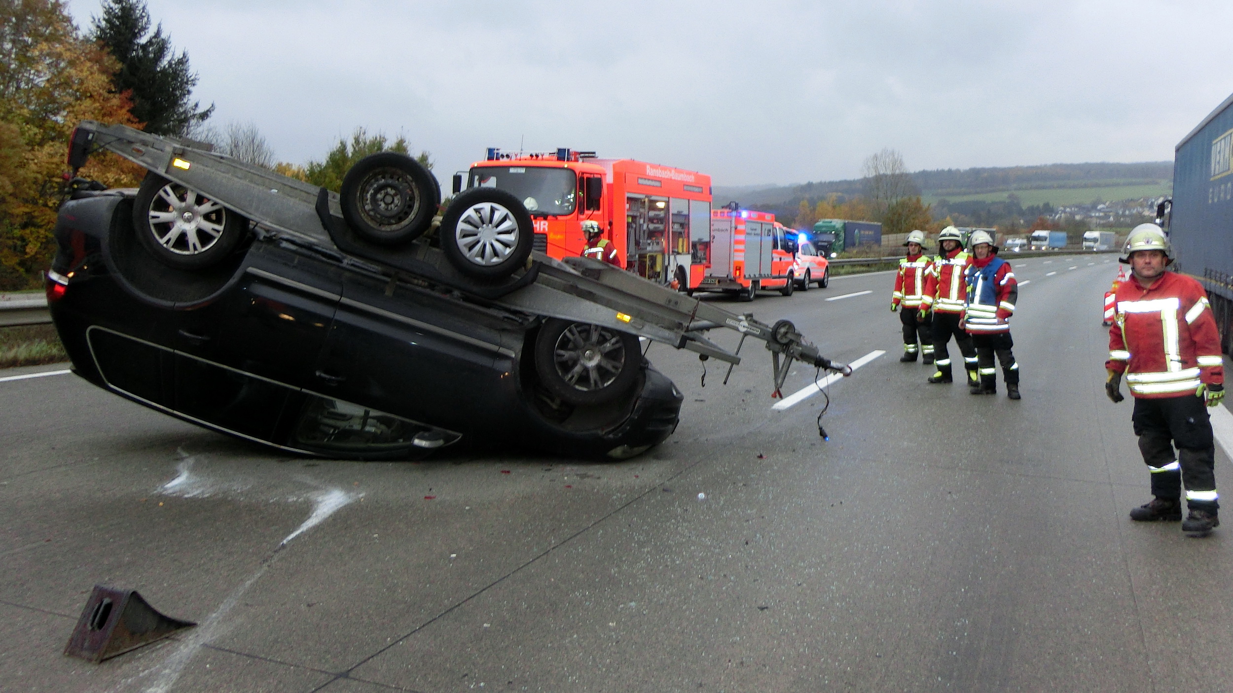 Verkehrsunfall PKW überschlagen Datum: 4. November 2021 Alarmzeit: 14:40 Uhr Dauer: 1 Stunde 47 Minuten Art: H2.03 VU P Klemm Einsatzort: Autobahn A3 Fahrzeuge: KdoW, ELW1, KLAF, MZF, TLF 24/48, LF 20/20, RW-2 Weitere Kräfte: – FEZ RaBa -, Rettungsdienst Einsatzbericht: