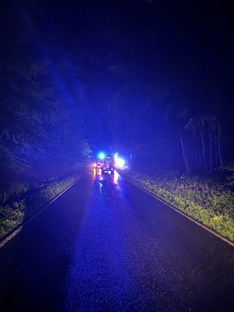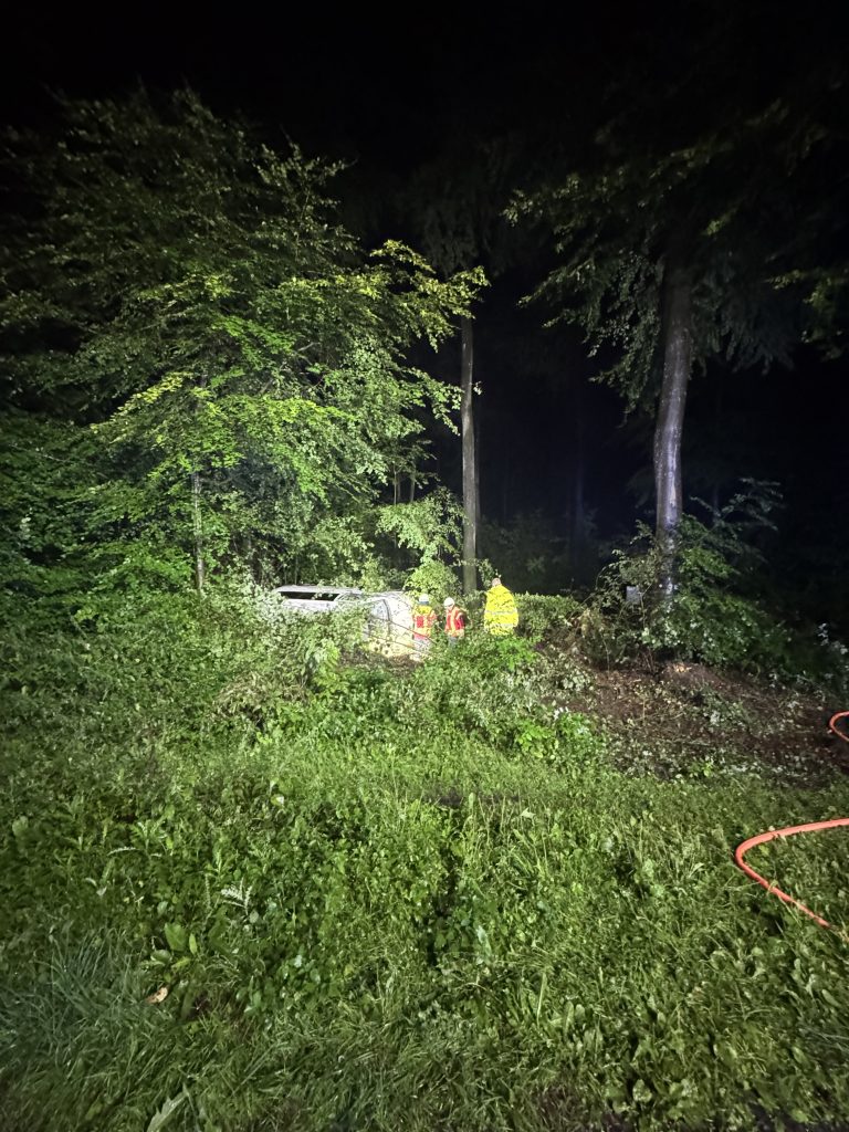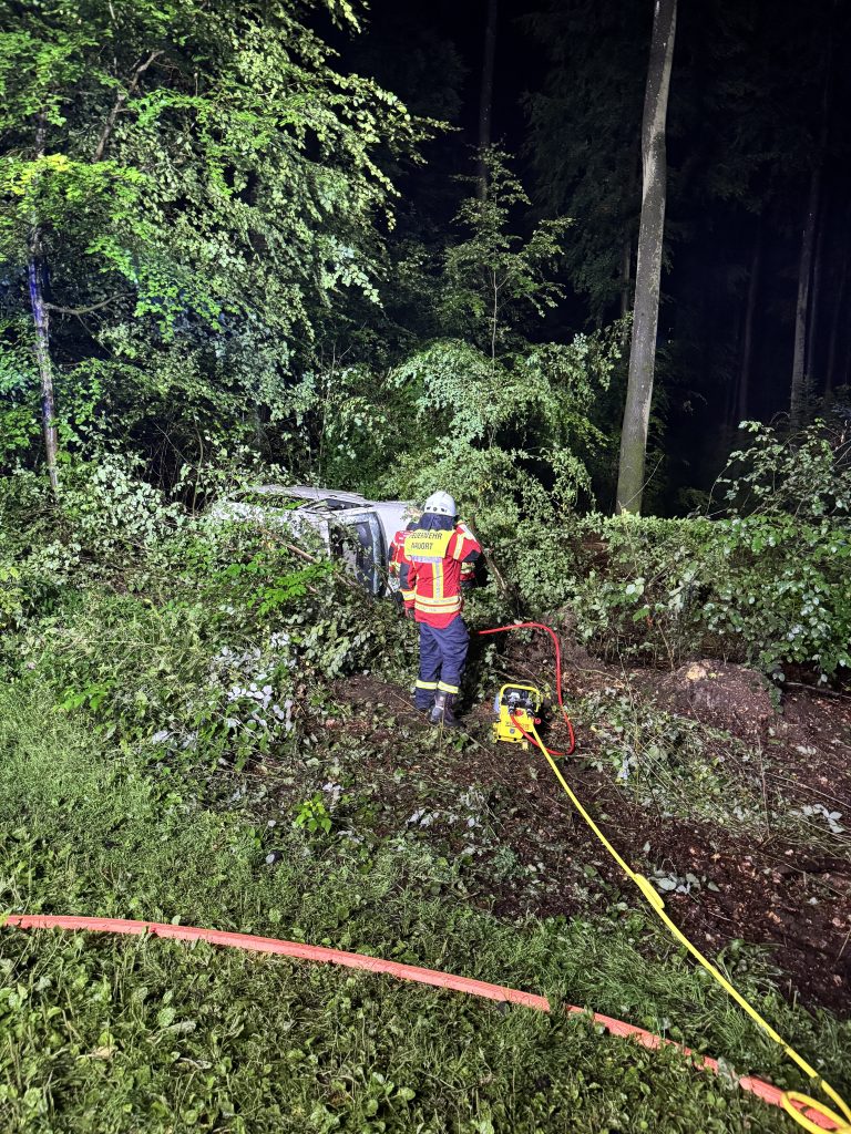 Ein Auto hat bei regennasser Fahrbahn die Kontrolle verloren und ist infolgedessen von der Fahrbahn abgekommen und erst in der dicht bewachsenen Böschung, auf der Seite liegend, zum Stillstand gekommen. Beide Insassen waren im Fahrzeug eingeschlossen und mussten durch die Feuerwehr gerettet werden.